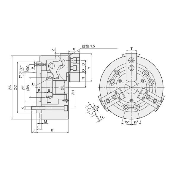 | SPEC Model | Max.Speed (r.p.m.) | Weight (kg) | Moment Of Inertia I(kg‧m2) | Matching Cylinder | Matching Hard Jaw | Matching Soft Jaw | Gripping O.D. Range (mm) |
